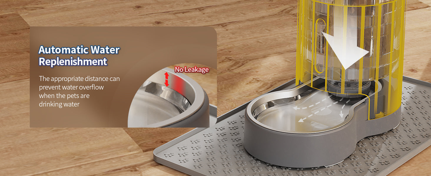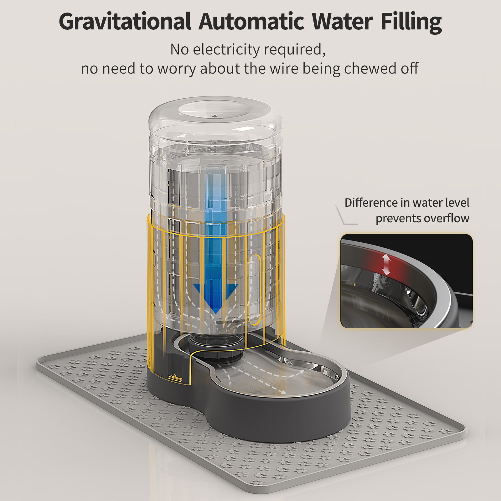 This pet waterer uses gravity to fill the water on its own, no electricity required, so you don't have to worry about the cord being chewed. The gravity water bowl for cats will automatically stop filling to prevent overflowing when the water in the base reaches a specific height.