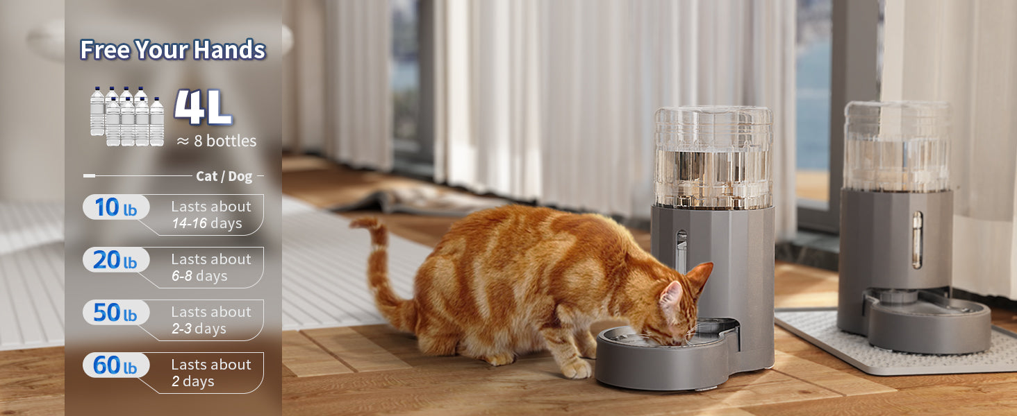 With a 4L capacity, the pet water dispenser is ideal for small to medium-sized dogs or cats and will sustain it for 2-10 days. You may use this automatic waterer for cats and dogs while traveling or at work, and you won't have to worry about your pet running out of water.