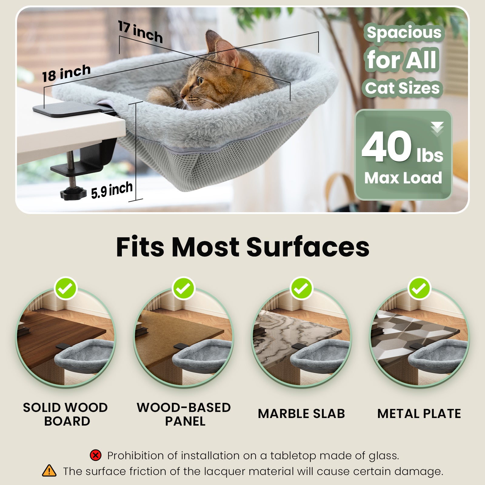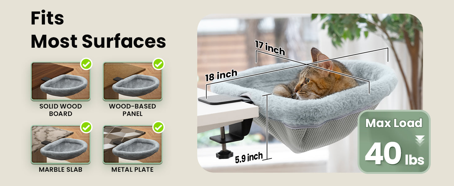 The maximum weight of the desk cat bed can reach 40 pounds, which ensures stability even if the cat jumps in, and is suitable for cats of various sizes. Suitable for all kinds of desktops, you can find the most suitable installation method regardless of your office environment.