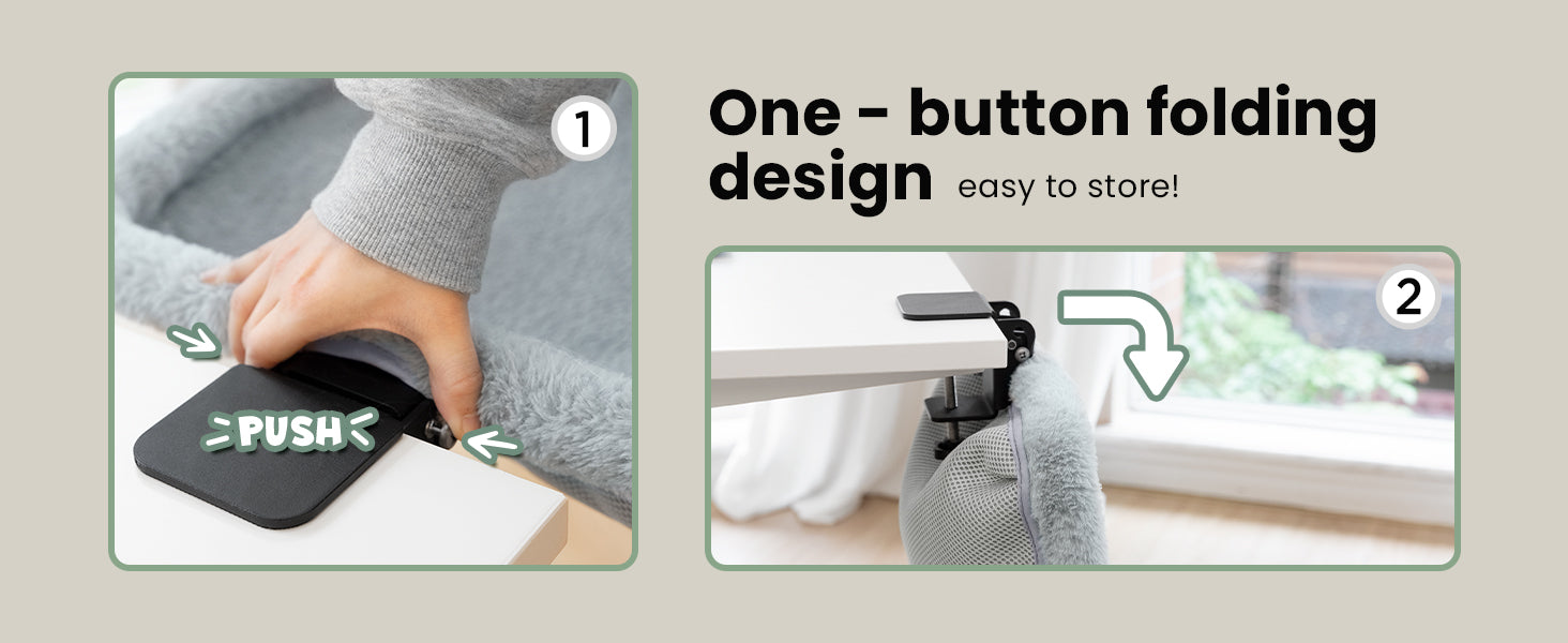 The cat hammock adopts a one-button folding design, which can be folded by pressing a button when not in use, which is convenient for storage. The cat perch is semi-circular, which fits more closely to the tabletop, makes full use of the vertical space, and improves the utilization of indoor space.