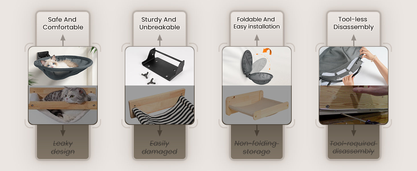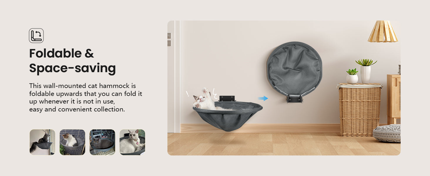 This wall-mounted cat hammock can be installed in a cabinet or on the wall without taking up floor space. It is foldable upwards so that you can fold it up whenever it is not in use, easy and convenient collection. When cats want to climb up to it for a nap, you just need to put it down. Can greatly improve the utilization of interior space.