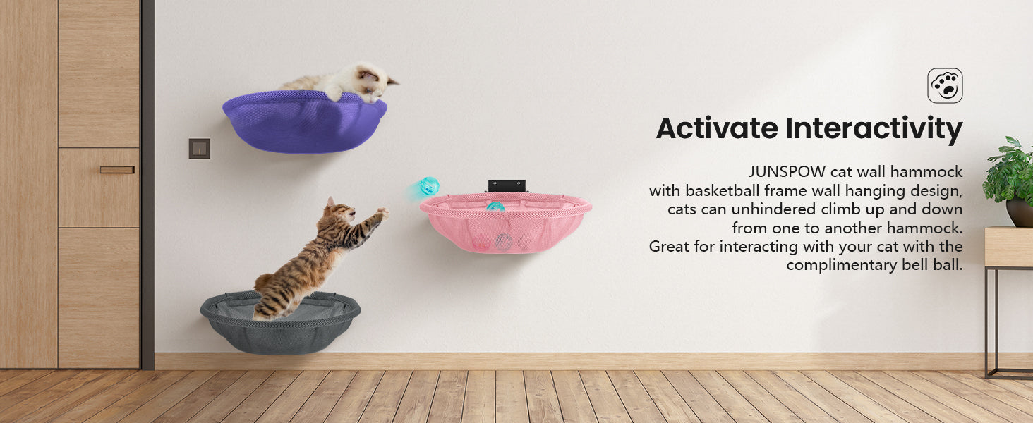 This cat wall hammock with basketball frame wall hanging design, cats can unhindered climb up and down from one to another hammock. Great for interacting with your cat with the complimentary bell ball. The dimension size is 16.5in x 16.5in, suitable for most sizes of cats, It is a comfortable elevated perch for cats with a wider view, away from dogs and children.