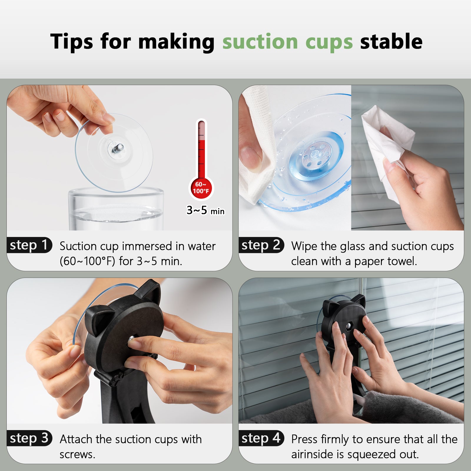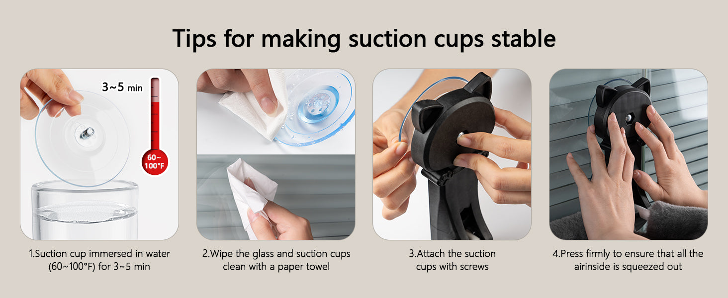 To ensure the suction cups stick firmly to the window, soak them in hot water for 3 minutes to soften them. Dry them until they are just slightly damp, and clean the window. Apply the suction cups to the window and press firmly to squeeze the air.
