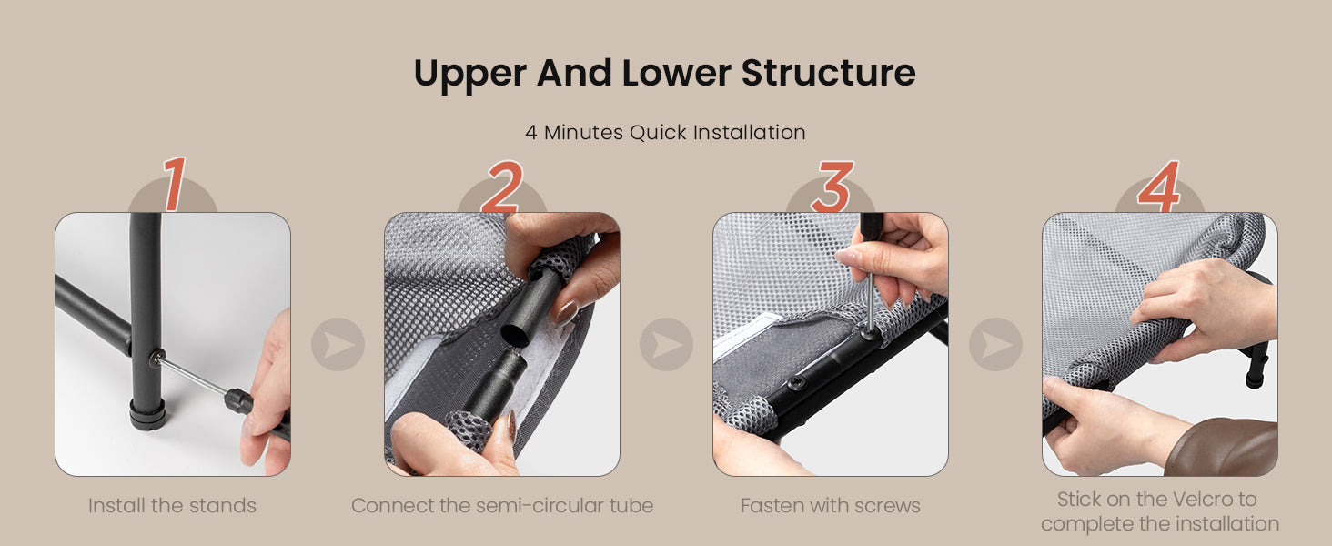 Compared to the round cat hammock, the square cat hammock is more convenient to disassemble and wash because it adopts the upper and lower structure of the hammock. The product comes with a screwdriver so no additional tools are necessary. Only about 4 minutes are required to install the product.